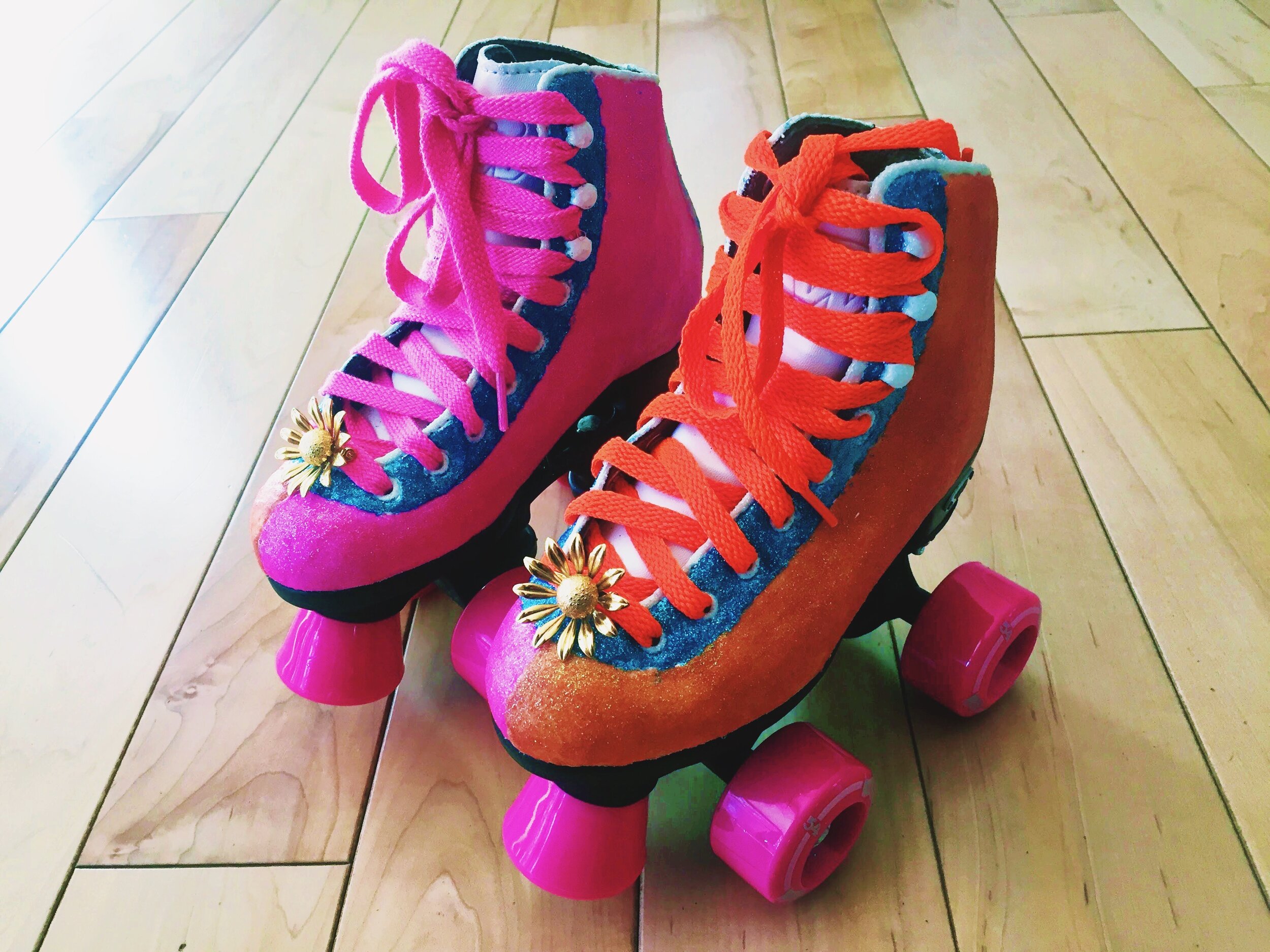 I bought a basic white pair from my local roller rink (I will include some online retailers below), bought some colored laces, and got to customizing in the birthday girl’s favorite colors. You basically mix ModPodge and glitter and apply with a paintbrush in coats until you achieve your desired color. I wanted to do each skate half fuchsia and half orange, and used painters tape to make clear lines.